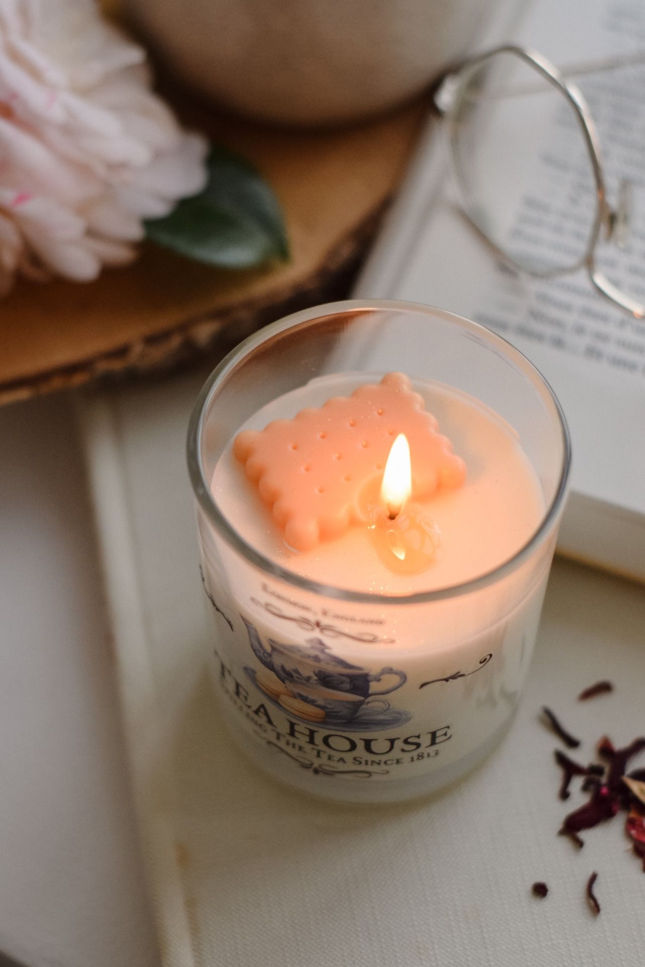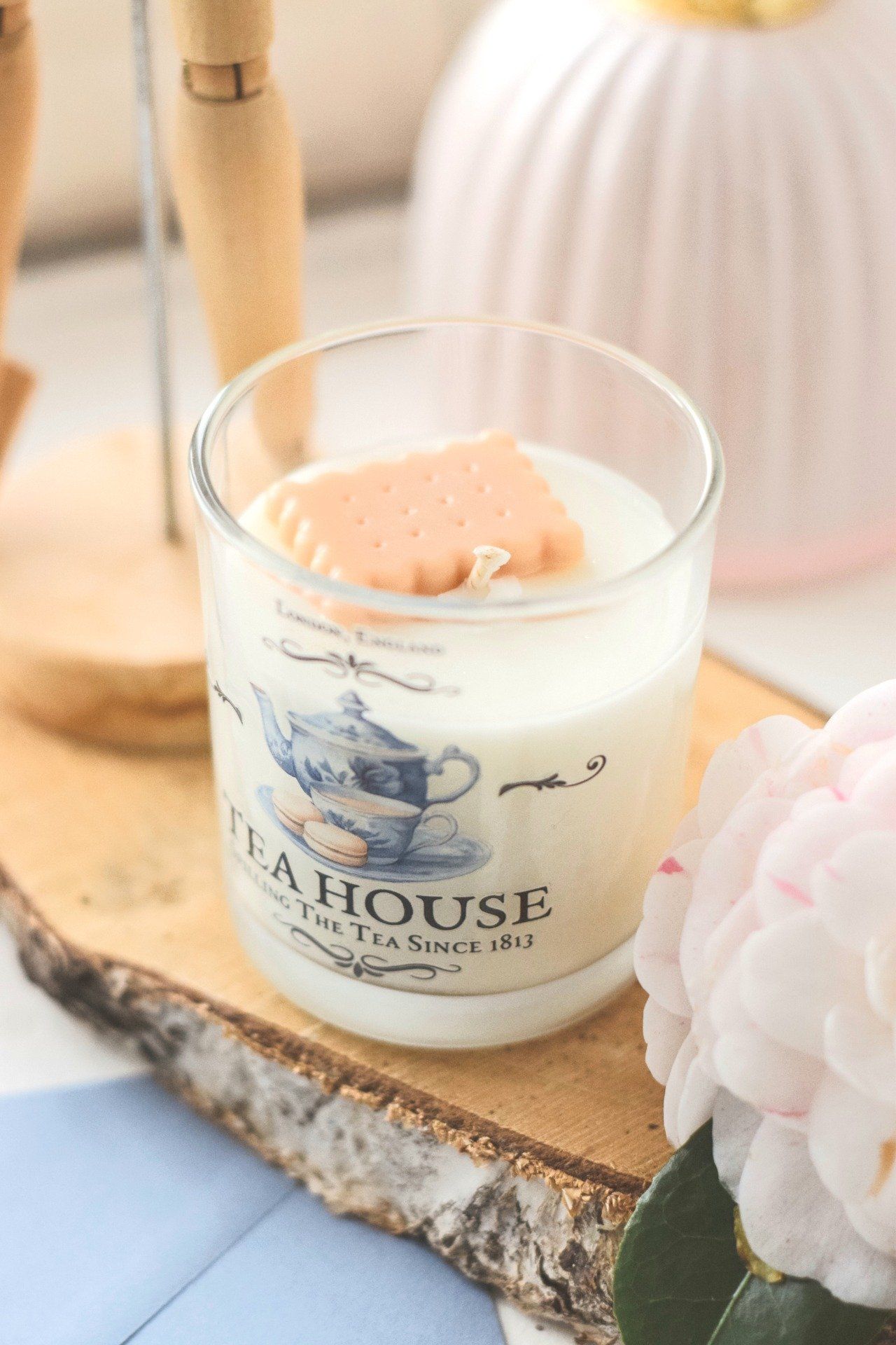 Son design élégant est complété par un biscuit décoratif en cire, rappelant les douceurs servies à l’heure du thé, pour une touche originale et raffinée.