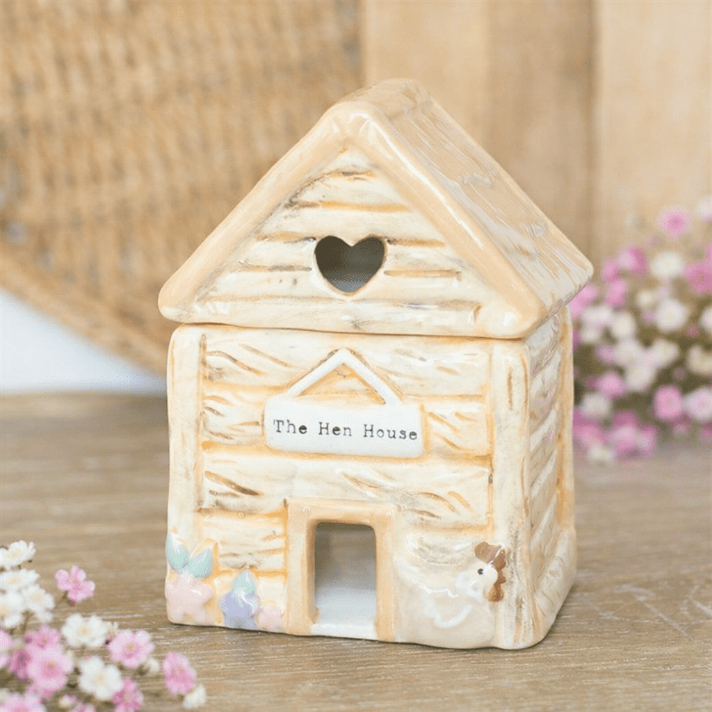 Brûle-parfum en céramique en forme de poulailler, orné d'une découpe en forme de cœur et d'un adorable panneau « Le Poulailler ». Toujours retirer le couvercle avant utilisation. Ne jamais laisser une bougie allumée sans surveillance.