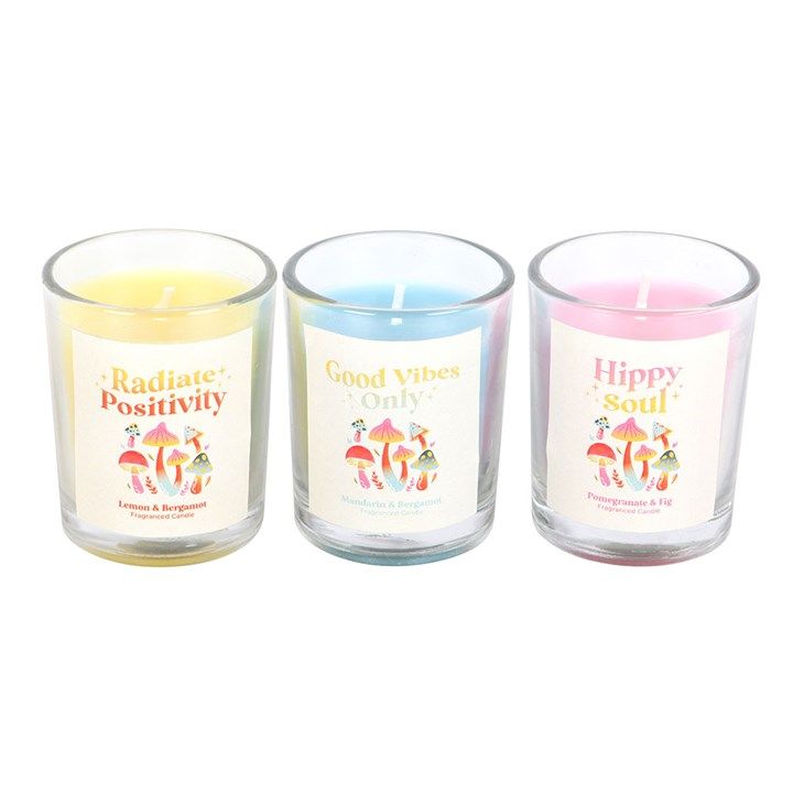 Embaumez votre intérieur d'une senteur fraîche, originale et positive grâce à ce lot de 3 bougies en verre. Chaque bougie diffuse un parfum différent : Hippy Soul (grenade et figue), Radiate Positivity (citron et bergamote) et Good Vibes Only (mandarine et bergamote). Durée de combustion moyenne : 8 heures par bougie. Cire de paraffine. Non conçue par Une si Jolie Bougie.