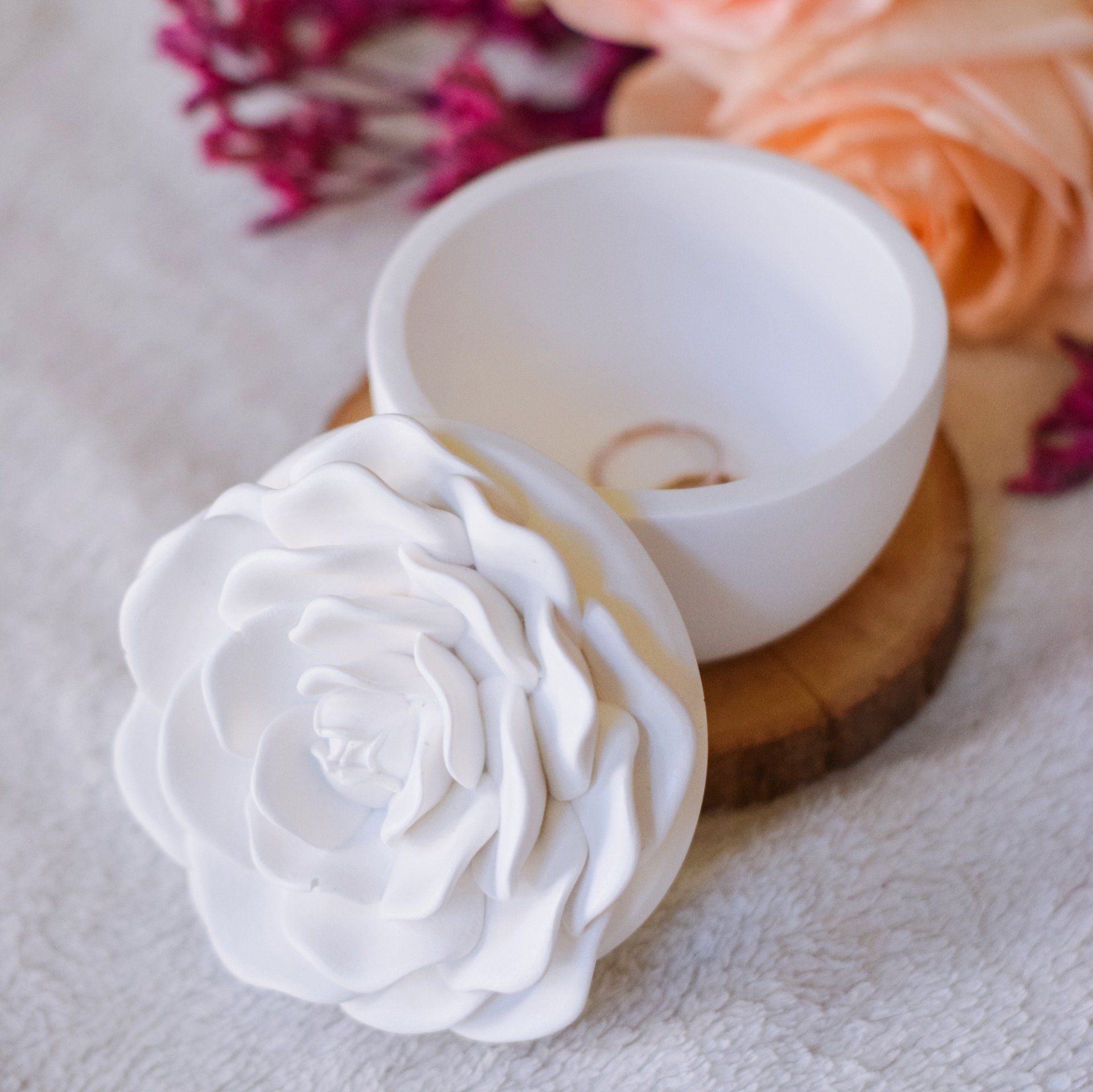 Cette boîte décorative en forme de fleur est une pièce délicate et élégante, entièrement fabriquée à la main. Son couvercle sculpté en pétales apporte une touche florale raffinée, idéale pour une décoration douce et romantique. Chaque pièce est unique, avec de légères variations qui témoignent de son caractère artisanal.