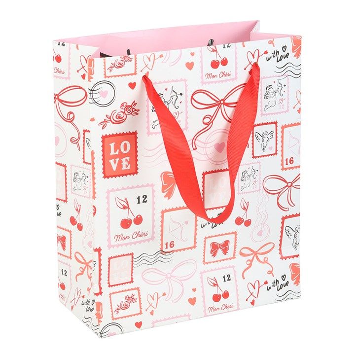 Emballez vos surprises de la Saint-Valentin dans ce sac cadeau en papier, orné d'un motif ludique de timbres-poste inspiré des lettres d'amour et des mots doux. Une façon mignonne et pratique d'offrir des témoignages d'amour et d'affection. 23 cm.